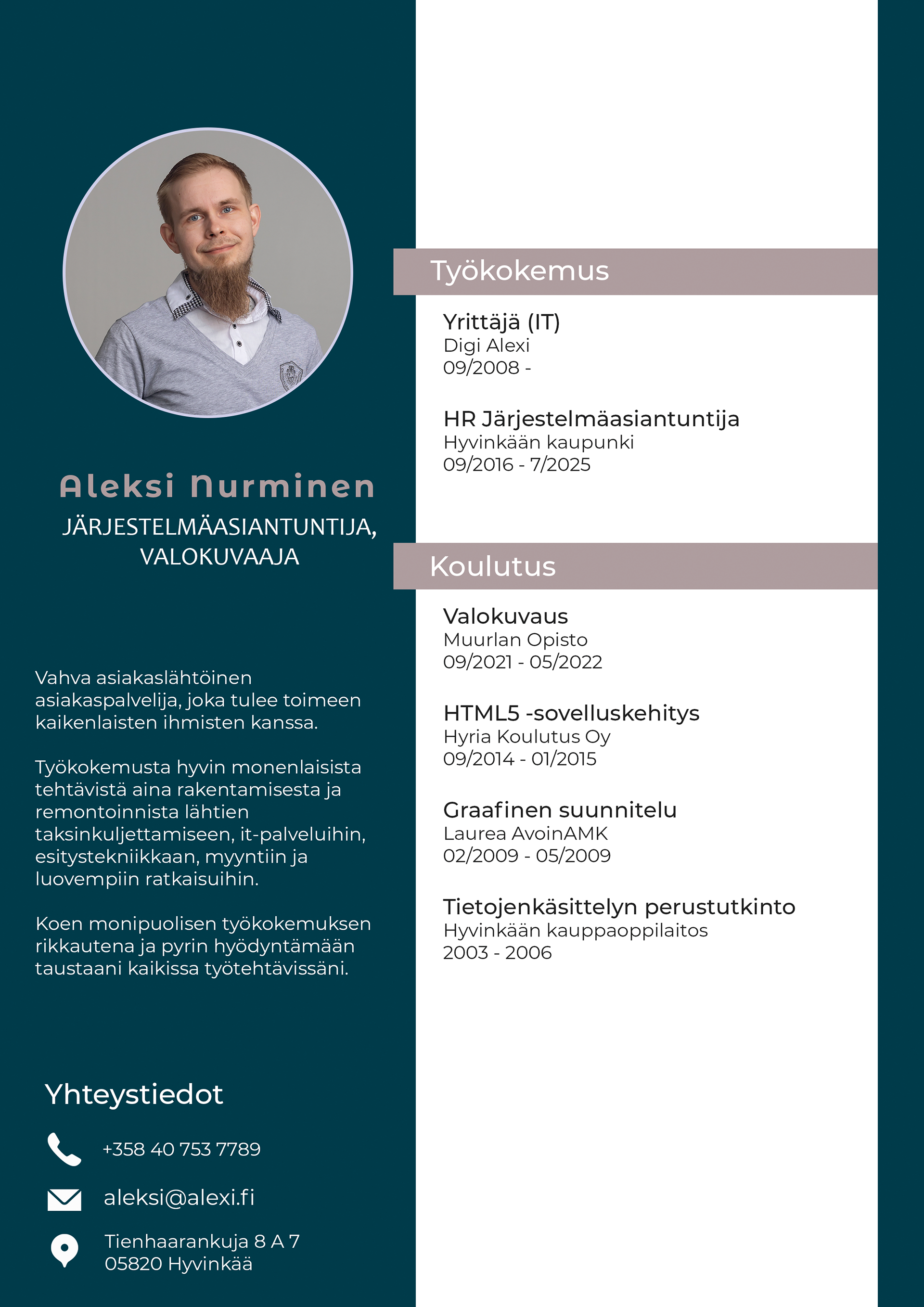 Viime vuodet olen työskennellyt Hyvinkään kaupungilla HR Järjestelmäasiantuntijana. Työtehtäväni on painottuneet HR-järjestelmien kokonaisvaltaiseen hallintaan, eli pääkäyttäjyys, järjestelmien ylläpito ja kehittäminen sekä koko henkilöstön käyttäjätuen antamiseen, sekä tarvittavaan kouluttamiseen. Työtehtäviini on sisältynyt myös palkanlaskennan pääkäyttäjyys ja tarvittaessa koko palkanmaksuprosessin toteuttaminen palkanlaskentajärjestelmässä. Olennainen osa työtehtäviäni on ollut myös olla erinäisiin sidosryhmiin/järjestelmätoimittajiin yhteydessä ja koordinoida järjestelmiin liittyviä muutostarpeita ja kehittämistä.